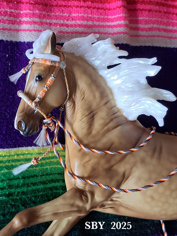 ![]() ![]() ![]() ![]() ![]() ![]() ![]() ![]() ![]() ![]() ![]() ![]() ![]() | Come on board and enjoy this gallery of artist Susan Bensema Young, model horse tackmaker since 1979 and author of two books exploring this beloved field of creativity! The great classic Guide to Making Model Horse Tack was published in 1998 and updated 2016. As of January 30, 2026, its price is now $14.99 -- still a terrific bargain! Our newest book is now out! Advanced Braidwork for the Model Horse was uploaded in August 2025 and is available in .pdf! Click on the icons to the left for each book to find out all about them. Here is a lovely shot of Rummo aka Future is Bright, Special Run from BreyerFest 2025, and Dry's Orange Hackamore, which he has temporarily pinched from Dry the Sea. August 30, 2025 The Abaft is ready!! I am not more excited than the rest of you -- it's been a very long haul. Work on this beautiful book began back in June of 2022, so it's been three years and 2 months. The final count is 225 pages, 393 photos and 47 plates. Although I have always wished it could be available in paper, and laid out the pages and pictures with that in mind, at this time I cannot fulfill print orders. Not only do I not have the time and wherewithal, my husband has forbidden it (he knows how exhausting the paper Guides were). This dream will still have to wait. I'm not saying it's impossible; I'm just saying I want to go back to making tack for a few years, and research print-on-demand a little further. It's not so hard for you to print your own copy. If it weren't for the pdfs we wouldn't have this book available at all!! In the meantime, enjoy the past works of the Timaru Star II with this home page and all the rest of the website. Pieces shown here go back to 2018. March 13, 2024 Once again it's been almost 2 years since the previous update! Clearly this website is for longer time spans; but there is still relevant news to be found here. Remember the Guide to Making Model Horse Tack is NOT duplicated in the new book, but forms its foundation. If you want to learn how to make tack, you couldn't do better than to get both books. You are invited to view the workings of the TSII on its FaceBook page, Timaru Star II Model Tack (link above on right). The Susan Bensema Young FaceBook page tries to carry everything that is not TSII, but there is much overlap. This page will continue to review some of our tack, made from about 2018 (Brasenose's bridle and neckpieces) to December of 2022. Enjoy! A word on the blanket of this set. It was knitted by Lizzie Chelius Kanavy, a non-hobbyist but a very good and kind friend. Here we see the entire saddle on Straight Bet, known as Toucano in my herd. These next three photos show close ups of #457, Eleanor's Goehring No. 2. The metal used was Argentium, man-made silver that doesn't tarnish hardly at all. I do all my own engraving. The uppermost, first picture was taken by the owner at time of delivery. This is TSII #457, the second Clyde Goehring Mexican Parade Silver Saddle built. It was delivered in October of 2020 in person, something that took many weeks to arrange. During the visit, the bit was swapped for one I had given Eleanor a year before; but did I remember to then photograph the set? Hah, no. She did, and sent me this. Whereupon I promptly proceeded to stash the picture in a place I couldn't find until now. The saints alone know what goes on in one's computer files... Pretend the mouthpiece of that bit is just below the ring of the bithead, above the hole, right where his mouth corner would be. It could fit. There are eight blog posts on just this one saddle. A list of them is in the blog post for October 11, 2020. We braided these reins from waxed linen thread, and engraved all the Argentium. One of the thrills of the past 3 years has been the rise of the Akhal Teke in my collection of model horses. I did not know I had it in me to fall in love with another breed! Finding out about this lovely exotic breed of horse inevitably expressed itself in making their beautiful silver-ornamented halters, bridles and neckpieces in miniature. So far the TSII has made five Akhal Teke sets, of which this green one is the second, known as AT2. Those are real emeralds, courtesy the Tucson Gem Show (and Gems-4-Less!). The horse is Brasenose, my first NaMoPaiMo horse -- I painted him myself! He was sculpted by Margarita Malova of Bologoye Russia, and I love him to pieces. I had so much fun with these. Although they were exhausting, with each little plate having to be individually hand-formed, I was very satisfied with the finished look. Of all model Teke sets I have ever seen, I like my own the best. However, I have not extended my attempts to their blankets and saddles. Here I think someone else could probably do really well. The new mold of Altynai just gave me more real estate to exploit. Saints preserve me from having to conga this big guy, but I already have two. This set, AT3, is owned by Carrie Sloan Meyer. Don't you love how the colors of the light blue Aquamarines went so well with this blue-eyed Perlino Lonesome Glory? Danielle Feldman, who owns this set, chose the stones for it, and I think she had excellent taste. This set is known as AT4, the fourth Akhal Teke Presentation set I ever made. The next section of this page looks at three TSII Western saddles that were either partially or completely rebuilt, restored and refurbished during the years 2020, 2021 and 2022. I'm only slightly surprised that this work represents fully half of my output these days. There are over 450 Western saddles out there by me, and many of them deserve to be fully restored. The saddle on Karen Gerhardt's lovely Arabian resincast Denderah is an oldie, TSII #89, built originally in 1985. It was lovingly rebuilt and refurbished in the summer of 2021. This effort spawned four extensive chapters of documentation on my blog. If you want to know more about taking these saddles apart and putting the