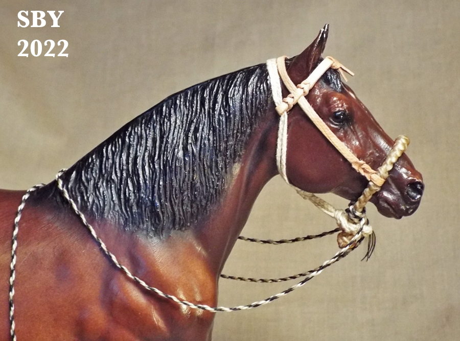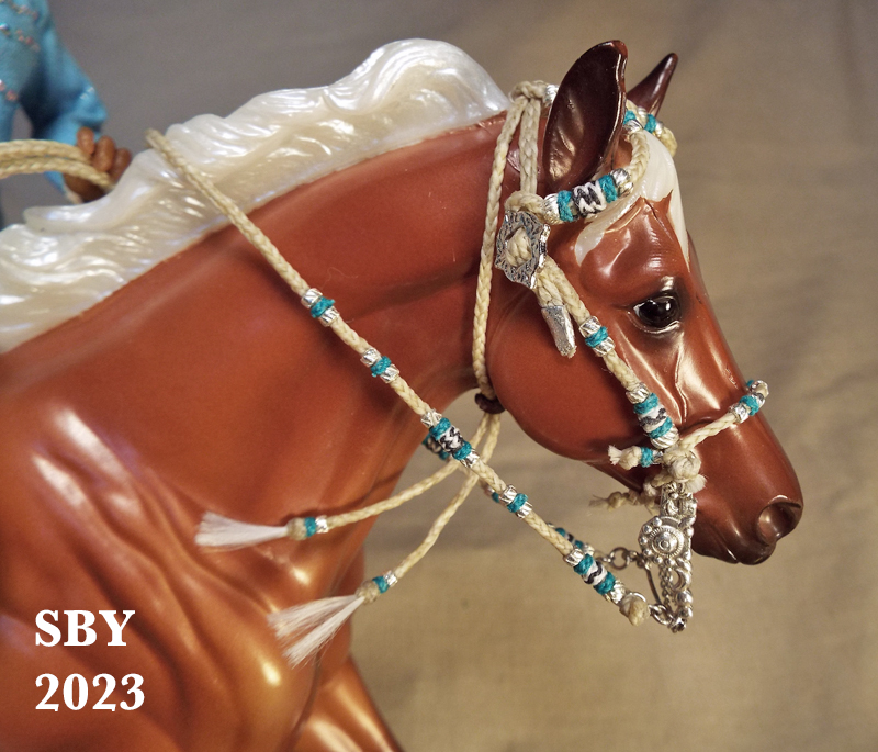 Bosals and Mecates, surely two of the most iconic and challenging subjects of miniature braidwork for model horses, form the majority of the second half of the book. April's Hackamore, Chapters 9 & 10, (Indian Pony lower right) and Fancy's Hackamore, Chapters 11 & 12, (central bottom Appaloosa ISH, with green) are two stops along the highway of the show Bosal Hackamore. Rinker's Hackamore, Chapter 13, is the last of the 3 bosal hackamores covered (left side Etched Smart Chic Olena). His is extremely advanced with its 3B Bosal in two colors and 6-strand handspun thread mecate. His bosal is combined with his headstall for Chapter 13.
