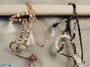 The Campbell bridle head-on, worn by Rarotonga. This face piece and the one on Butterminx' bridle are similar. They were made by splitting down the sinew beyond the usual 4 strands, a very difficult process. The tassels are made from cheap shreddy dental floss: less wax equals perfect miniature white horsehair... |