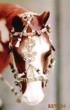 This is my first Western Show Halter with braided buttons on it, created in July 2000. The plates are handmade from Aluminum and handstamped with a customized tool,made from a leather stamp. It has proven very useful! |