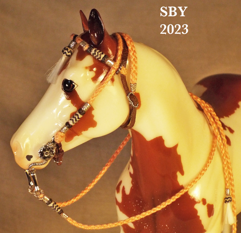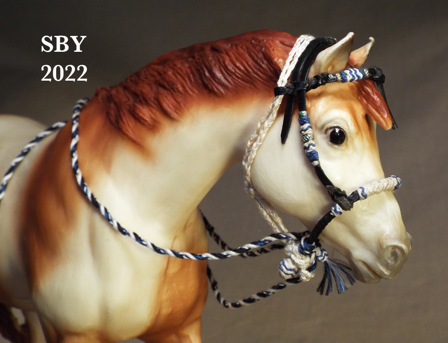 Bosals and Mecates, surely two of the most iconic and challenging subjects of miniature braidwork for model horses, form the majority of the second half of the book. April's Hackamore, Chapters 9 & 10, (Indian Pony lower right) and Fancy's Hackamore, Chapters 11 & 12, (central bottom Appaloosa ISH, with green) are two stops along the highway of the show Bosal Hackamore. Rinker's Hackamore, Chapter 13, is the last of the 3 bosal hackamores covered (left side Etched Smart Chic Olena). His is extremely advanced with its 3B Bosal in two colors and 6-strand handspun thread mecate. His bosal is combined with his headstall for Chapter 13.