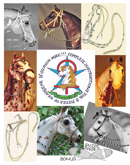 fondly referred to as the Abaft (because 'abaft-muh' is tooo clumsy!). There is a lot of braiding instruction out there, but almost none for the 1:9 scale model horse. I have wanted to document my miniature braidwork techniques for many years, and this is it! This 225 page book exhaustively covers eight of my favorite pieces of braided headgear and includes an Interlude with 5 more related subjects like Braided Rings and Rawhide Connectors, not to mention the Coda of rawhide braided Snow Shoes. There are 47 beautifully hand-drawn full page Plates and 323 photographs (all but 2 in color), buttressed by a couple of full page drawings. This is a book to inspire and expand the skills of any model tackmaker or aspiring miniature braider. It is aimed at those who have read the Guide but can be read on its own. It is truly a dream come true for me.