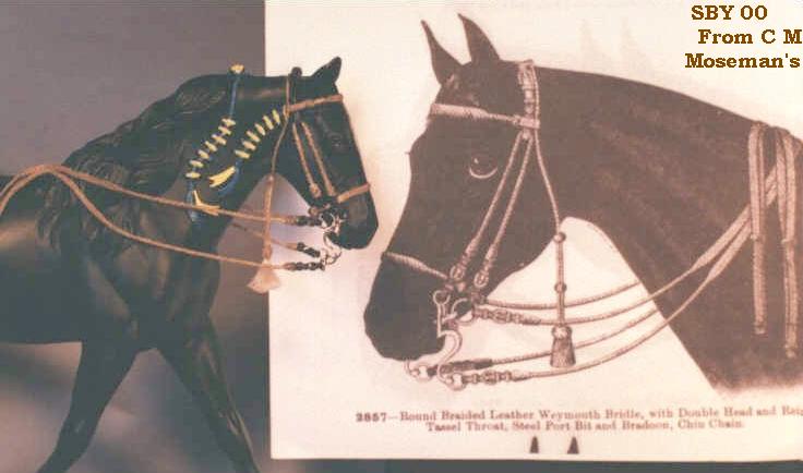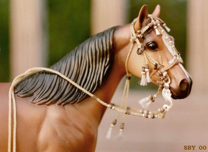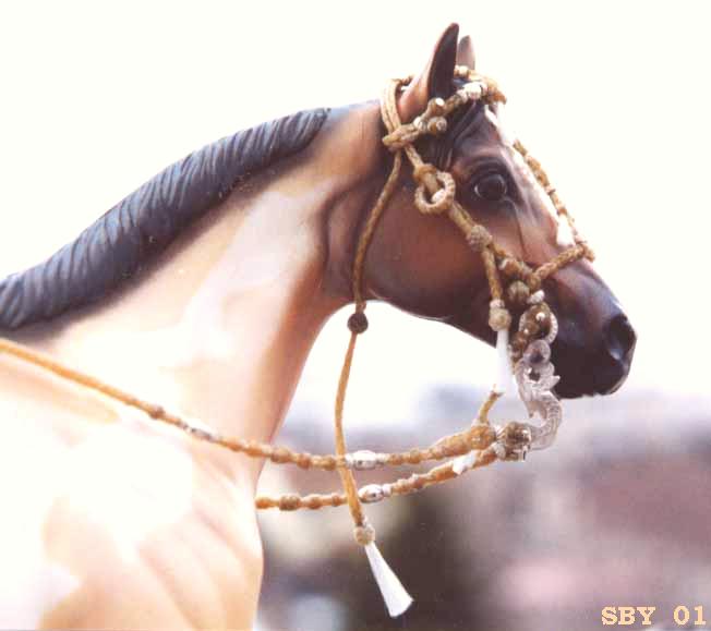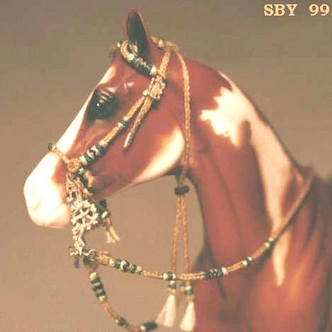 The second chapter in the story of this amazing bridle was its travels to Britain. Foolishly I placed a high value on it and shipped it off. After a long time, I heard that it had landed at her door---only to be turned away because of an unreasonably high tariff!! It actually came all the way back to me. I had the unusual chance to test and tighten my work again.....It was now decided to carry it to BreyerFest and personally hand it over to Mac & Vanessa of Horsing Around magazine. |