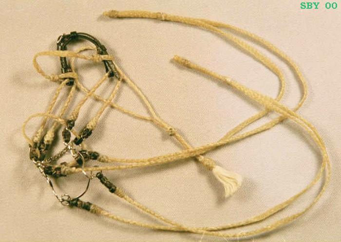The Campbell bridle head-on, worn by Rarotonga. This face piece and the one on Butterminx' bridle are similar. They were made by splitting down the sinew beyond the usual 4 strands, a very difficult process. The tassels are made from cheap shreddy dental floss: less wax equals perfect miniature white horsehair... |