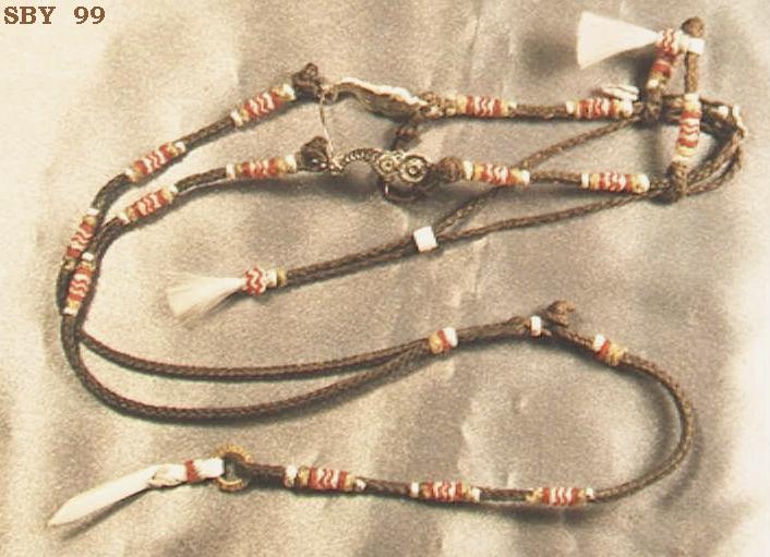 A brown sinew FBRB with red, white and sinew buttons. This bridle has an unusual number of buttons...most do not have so many. Finished 9901.26; owned by R. Nikolaidis. |