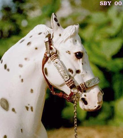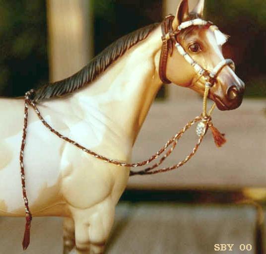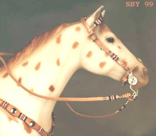 This is my first Western Show Halter with braided buttons on it, created in July 2000. The plates are handmade from Aluminum and handstamped with a customized tool,made from a leather stamp. It has proven very useful! |