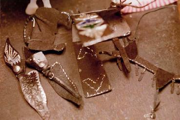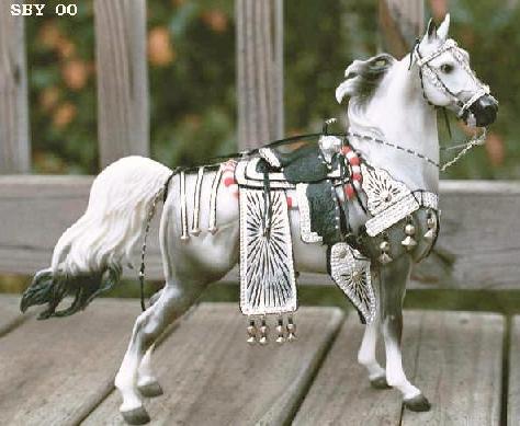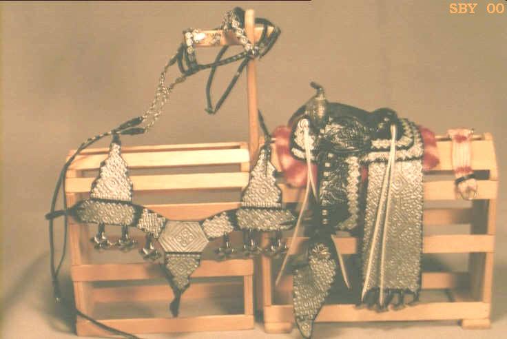It was in late August 2000 that I bought a new paintbrush while exploring new silvering techniques...I was in the hobby store where there was a sale. That got me thinking about recycling paintbrushes. I had a couple of beautiful old long red handles, with horrible nylon bristles. One handle became a sort of edge-slicker. I jammed a needle into the other, honed it down to a chisel, and not exactly in a flash of light started exploring ways of combining an old friend---Mylar tinsel lacing, long used for harness and Western---with an old silver enemy. Why does it take so long for new ideas to develop? One might as well ask why it takes so long to make tack. There needs to be a confluence of extra time, extra resources and extra creativity.