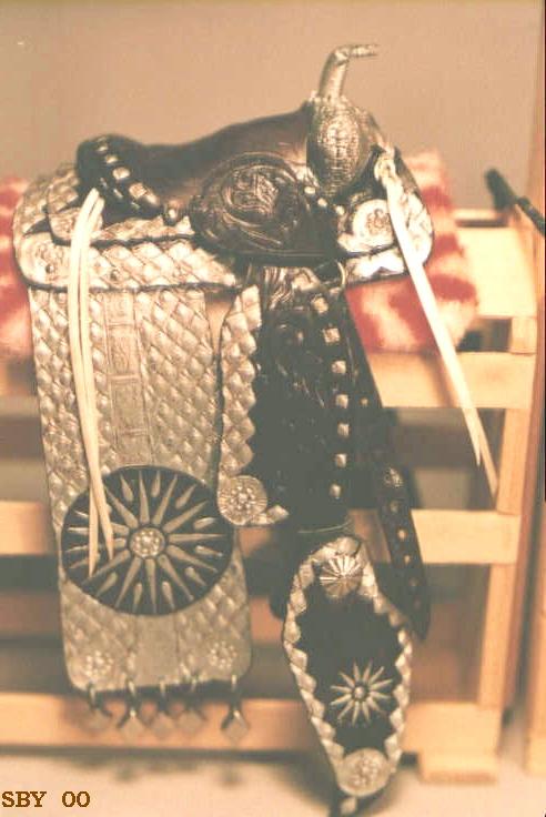 We have known since 1992 that the adhesive under the silver tape weakens with age. Sometimes only a few places on the set are affected. These places are almost always where the leather bends and flexes: the tops of the fenders and serapes (drapes); the tops of the bridle crown; the tops of the hip drops; and, sometimes, the edges of the skirts. Care and use also have an effect on the life of the adhesive. Sealed-away saddles last longer, while well-used ones tend to loosen up sooner.