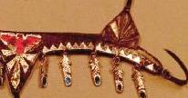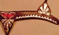 These two shots show the breastcollar of parade saddle TSII #306, BEFORE (feathers) and AFTER (still have to put the feathers back on). Note how the rays were falling off the near shoulder panel, and the triangles missing. I had to pierce the silver tape to hold down the triangles; note the dimples. For the squares and diamonds, the needle slit punch fit easily into the edge shadows.