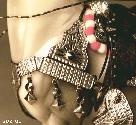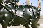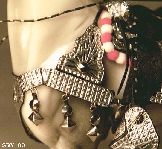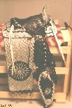 The Mylar tinsel lace is flexible, easily cut, and relatively easily tied (it can be slightly stretched). It is silver on one side, gold on the other. Best of all, it can be purchased at fly-fishing places for mere pennies. :) The picture shows lacing down finished on the fenders, serapes & breastcollar of TSII #306. Below is the entire set on 'Fancy'. It did not originally have hip drops. These hip drops were created by silver-lacing up black wide lace.