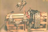 Some of the tape had begun falling off. It is seen here restored, with missing places retaped and the whole set carefully conserved by lacing down with Mylar tinsel. Click on the close-up of his shoulder, and see if you can spot the slightly-brighter silver areas where the Mylar lacing holds down the silver tape. Some are at the top of the shoulder, others at the top of the tapadero, and at the chest edge of the rectangular plate next to the chest shield. To repair a set like this, some places need invasive surgery (the corners of the triangle-shaped plate) and some places hide the lace perfectly (the small squares). Each parade set has different needs.